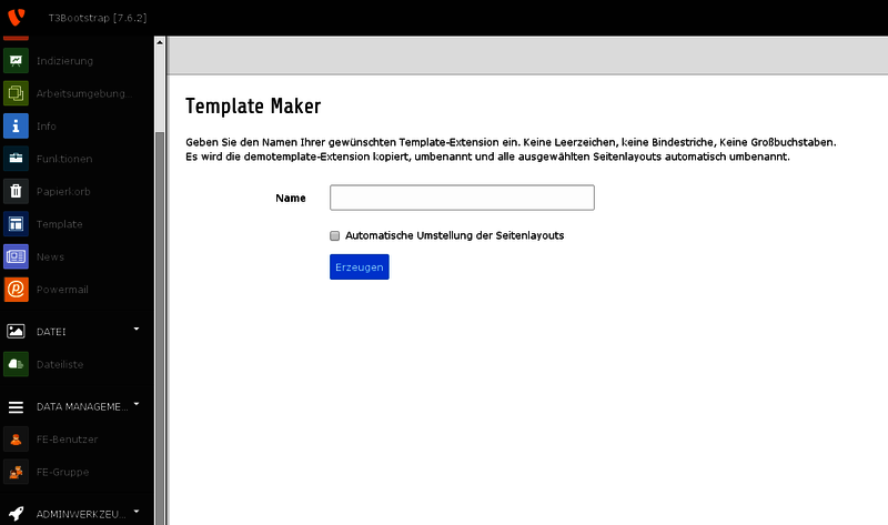 Mit dem Template Maker können Sie auf bequeme Weise Ihre eigene Template-Extension aus der Prototyp Extension demotemplate erzeugen. Geben Sie den gewünschten Namen ein, die Extension erzeugt eine Kopie und korrigiert alle Pfade auf die neue Extension.